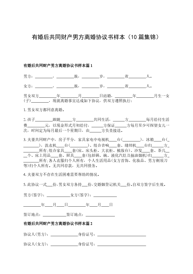 有婚后共同财产男方离婚协议书样本篇10