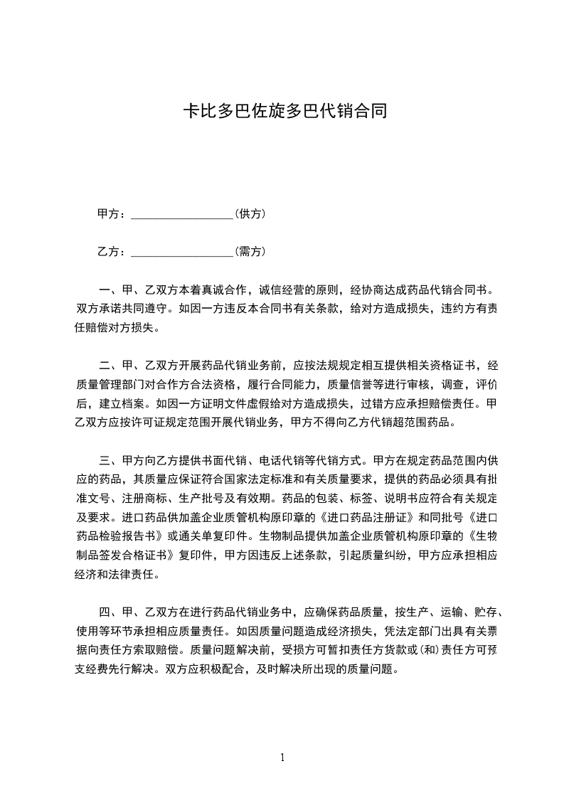 根据《中华人民共和国民法典》,甲、乙双方经协商确定,甲方向乙方代销药品。为明确双方责任和权利,特签订本合同,共同遵守。具体条款如下: