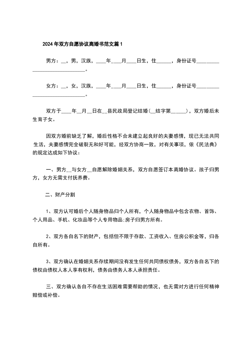 2024年双方自愿协议离婚书范文篇1