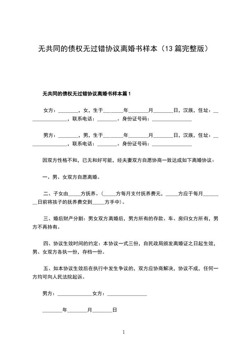 无共同债务无过错离婚协议书格式篇13