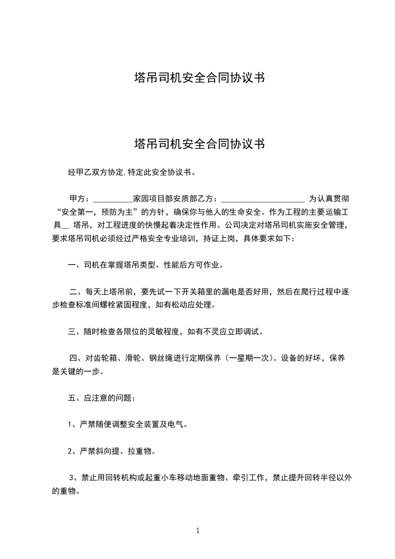 甲方:__________家园项目部安质部乙方:_____________________ 为认真贯彻“安全第一,预防为主”的方针,确保你与他人的生命安全。作为工程的主要运输工具__ 塔吊,对工程进度的快慢起着决定性作用。公司决定对塔吊司机实施安全管理,要求塔吊司机必须经过严格安全专业培训,持证上岗,具体要求如下: