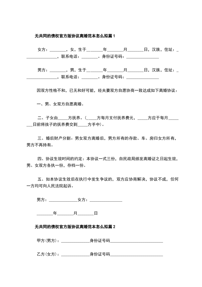 无共同债权官方版离婚协议怎么拟篇2