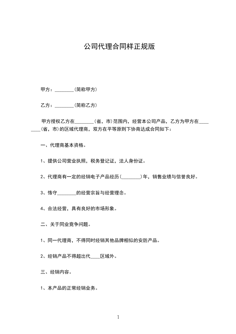 甲方授权乙方在________(省,市)范围内,经营本公司产品,乙方为甲方在________(省,市)的区域代理商,双方在平等原则下协商达成合同如下: