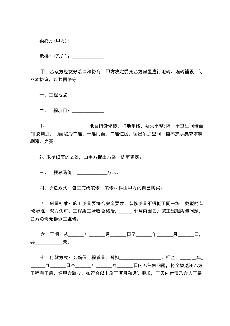 甲、乙双方经友好洽谈和协商,甲方决定委托乙方房屋进行地砖、墙砖铺设,订立本协议,以共同恪守。