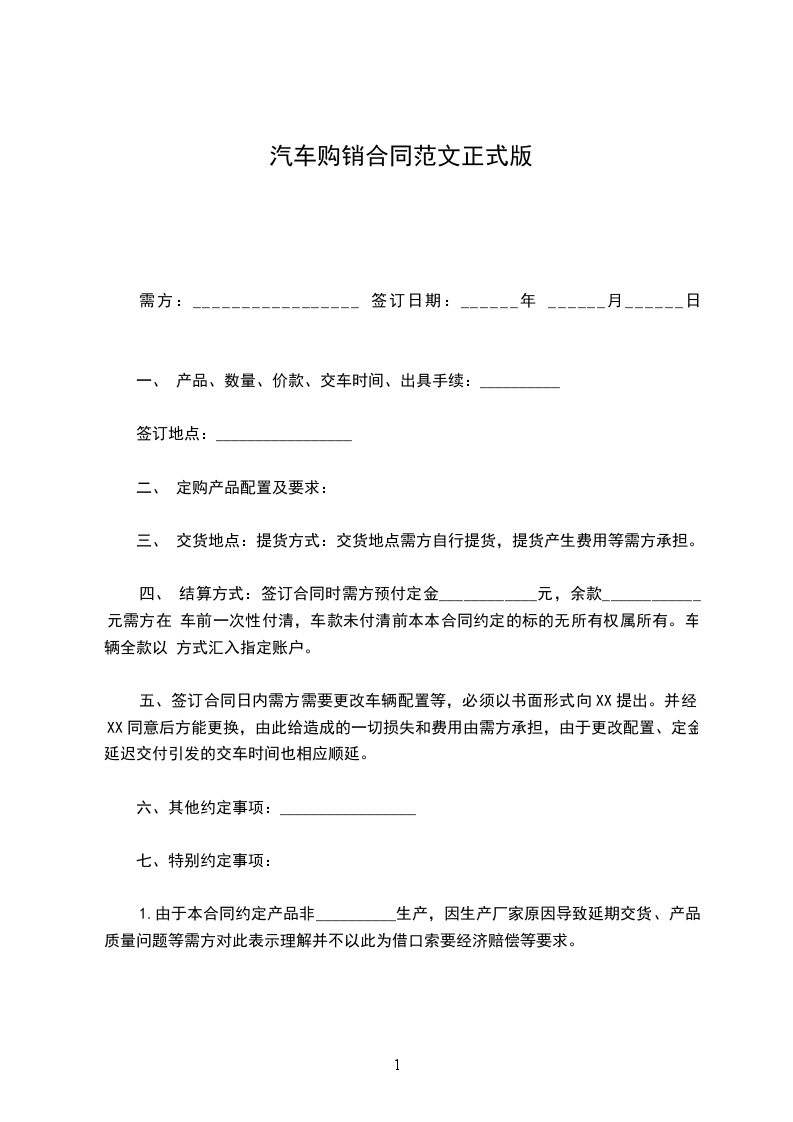 五、签订合同日内需方需要更改车辆配置等,必须以书面形式向XX提出。并经XX同意后方能更换,由此给造成的一切损失和费用由需方承担,由于更改配置、定金延迟交付引发的交车时间也相应顺延。
