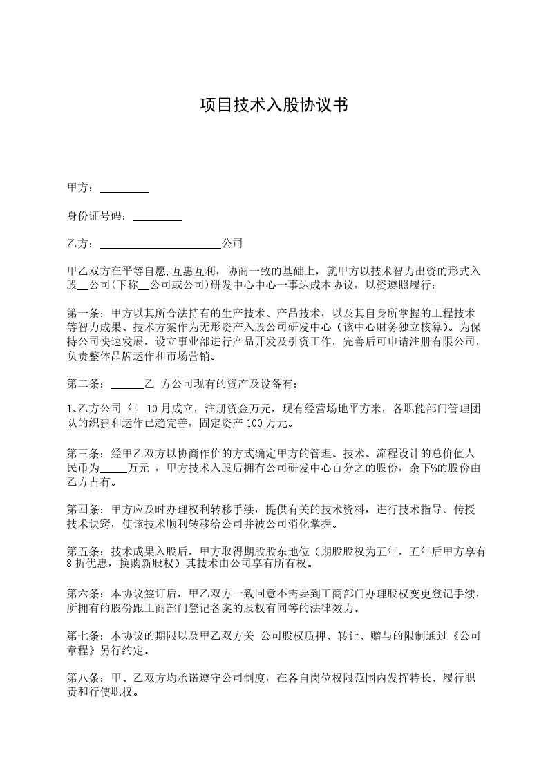第三条:经甲乙双方以协商作价的方式确定甲方的管理、技术、流程设计的总价值人民币为_____万元 ,甲方技术入股后拥有公司研发中心百分之的股份,余下%的股份由乙方占有。