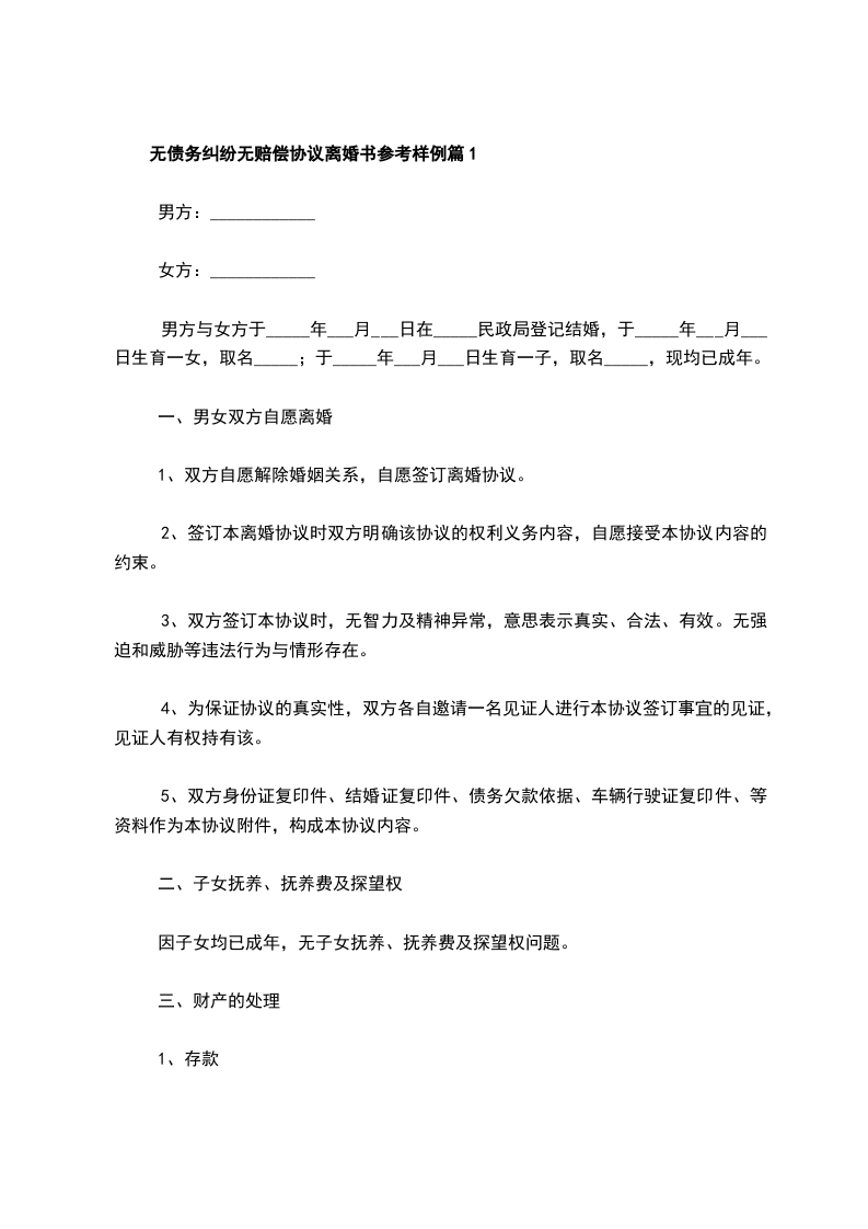 无债务纠纷无赔偿协议离婚书参考样例篇1