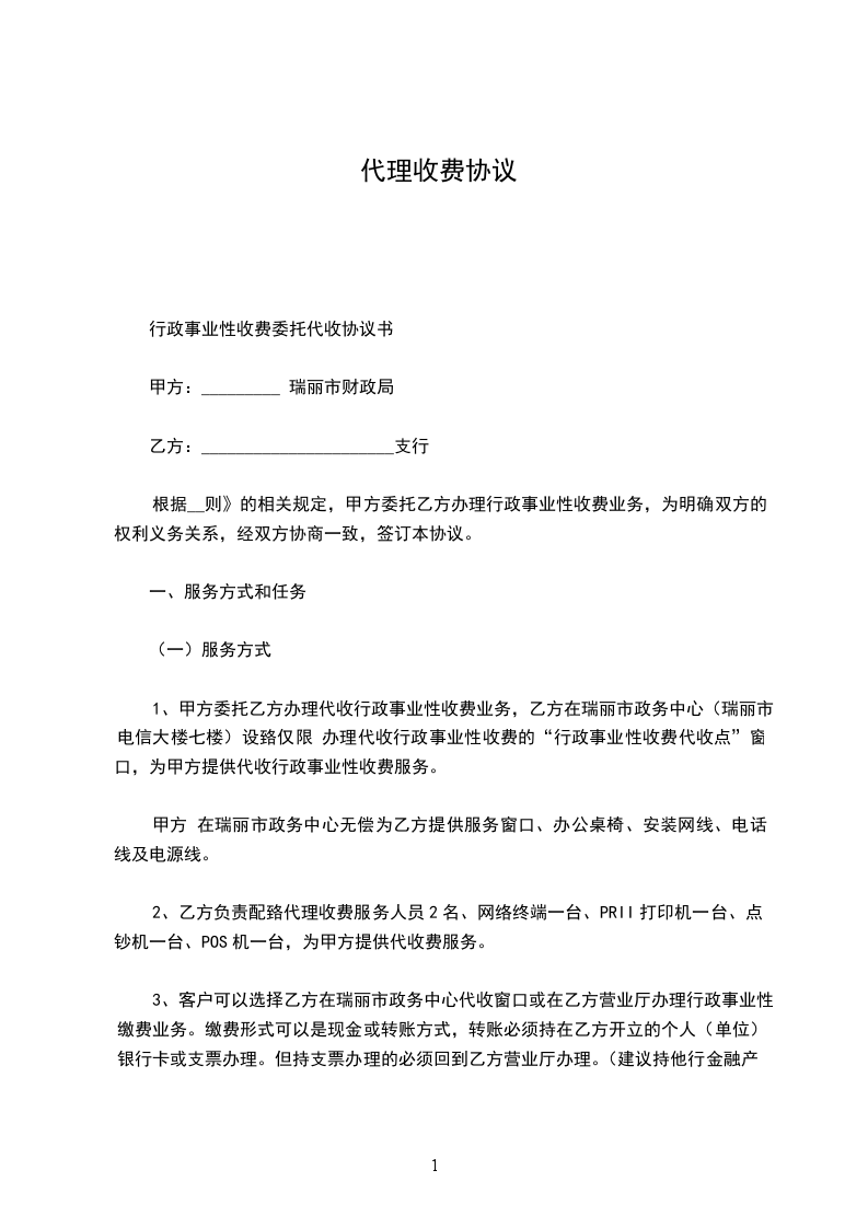 1、甲方委托乙方办理代收行政事业性收费业务,乙方在瑞丽市政务中心(瑞丽市电信大楼七楼)设臵仅限 办理代收行政事业性收费的“行政事业性收费代收点”窗口,为甲方提供代收行政事业性收费服务。