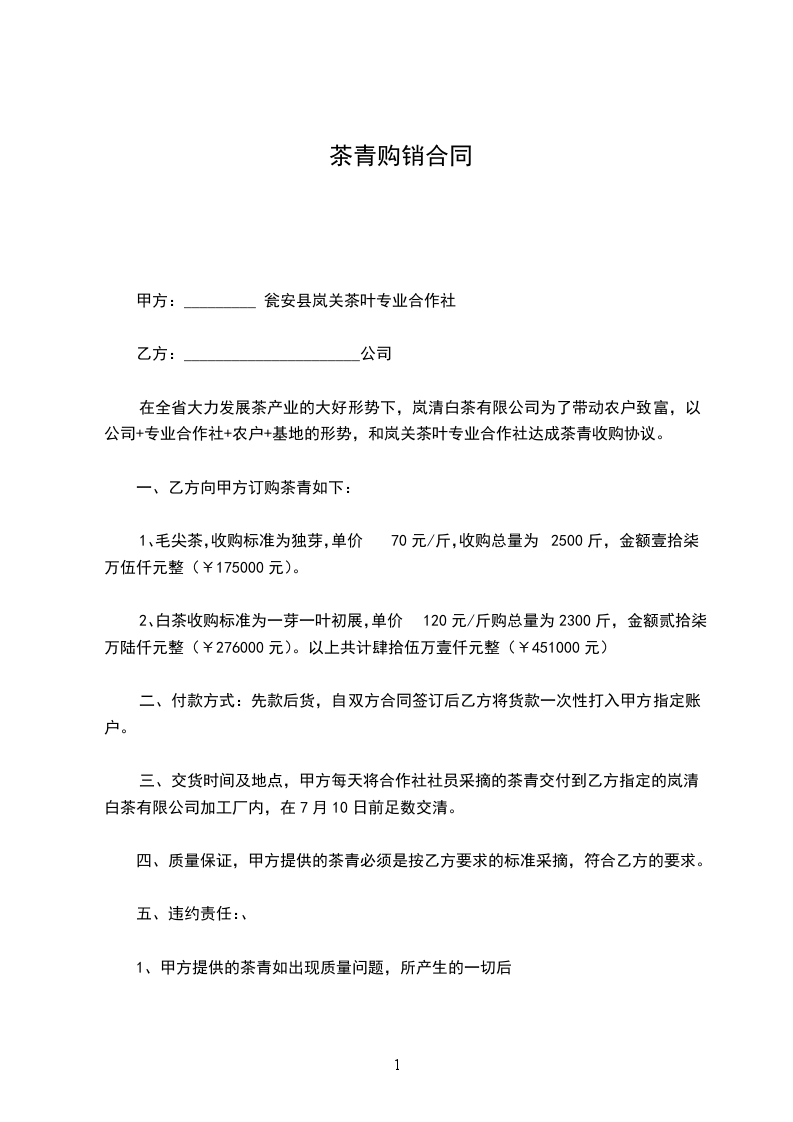 三、交货时间及地点,甲方每天将合作社社员采摘的茶青交付到乙方指定的岚清白茶有限公司加工厂内,在7月10日前足数交清。