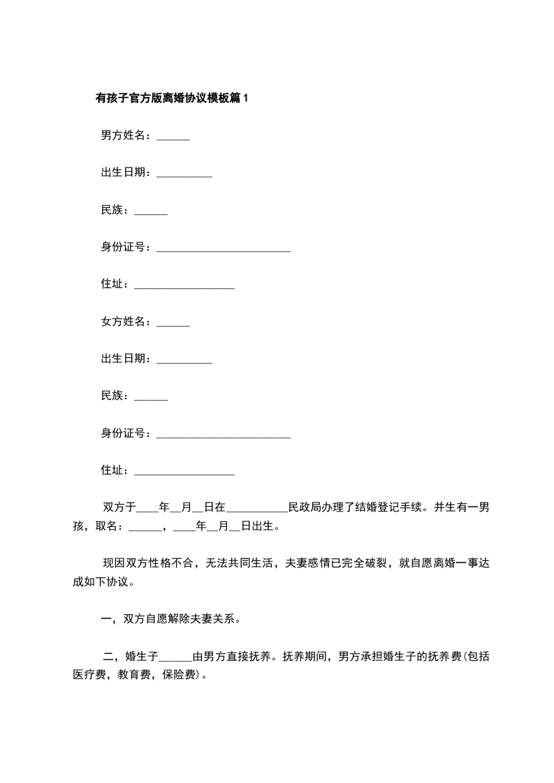 有孩子官方版离婚协议范文篇11