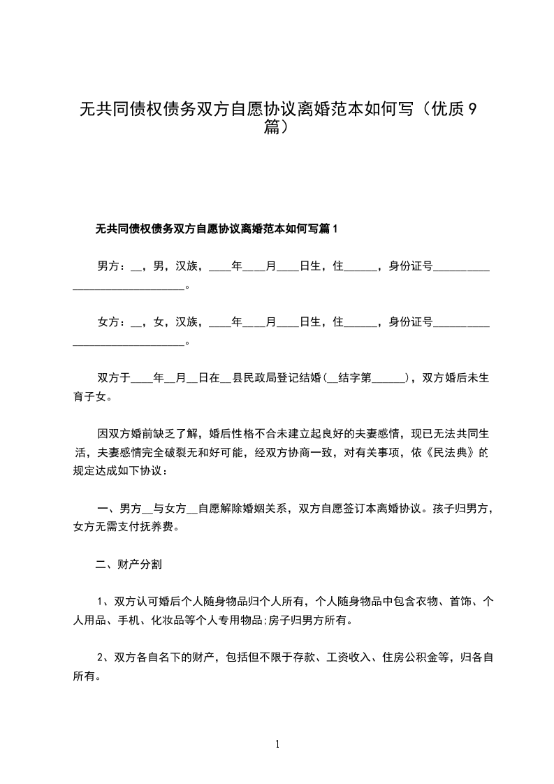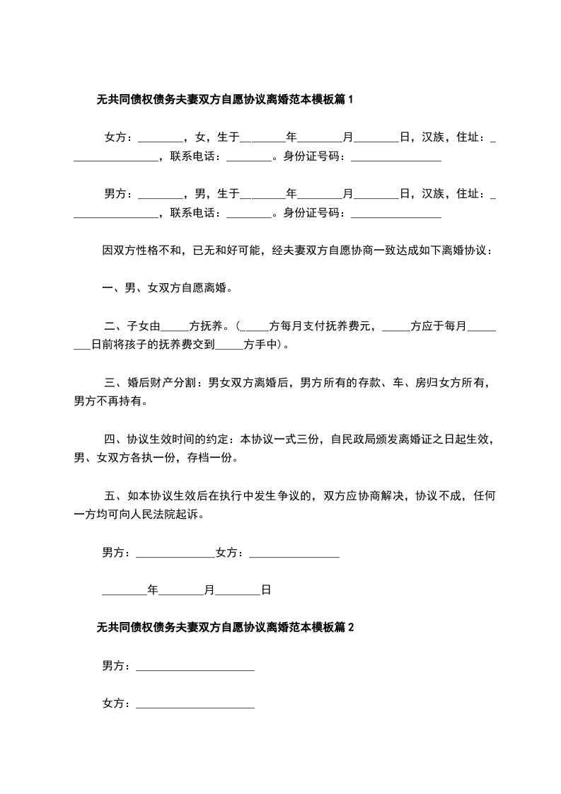 无共同债权双方自愿离婚协议格式篇9
