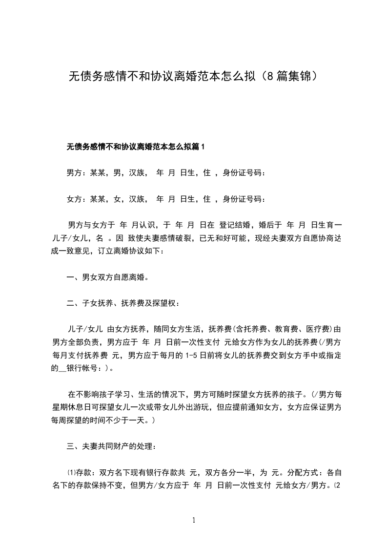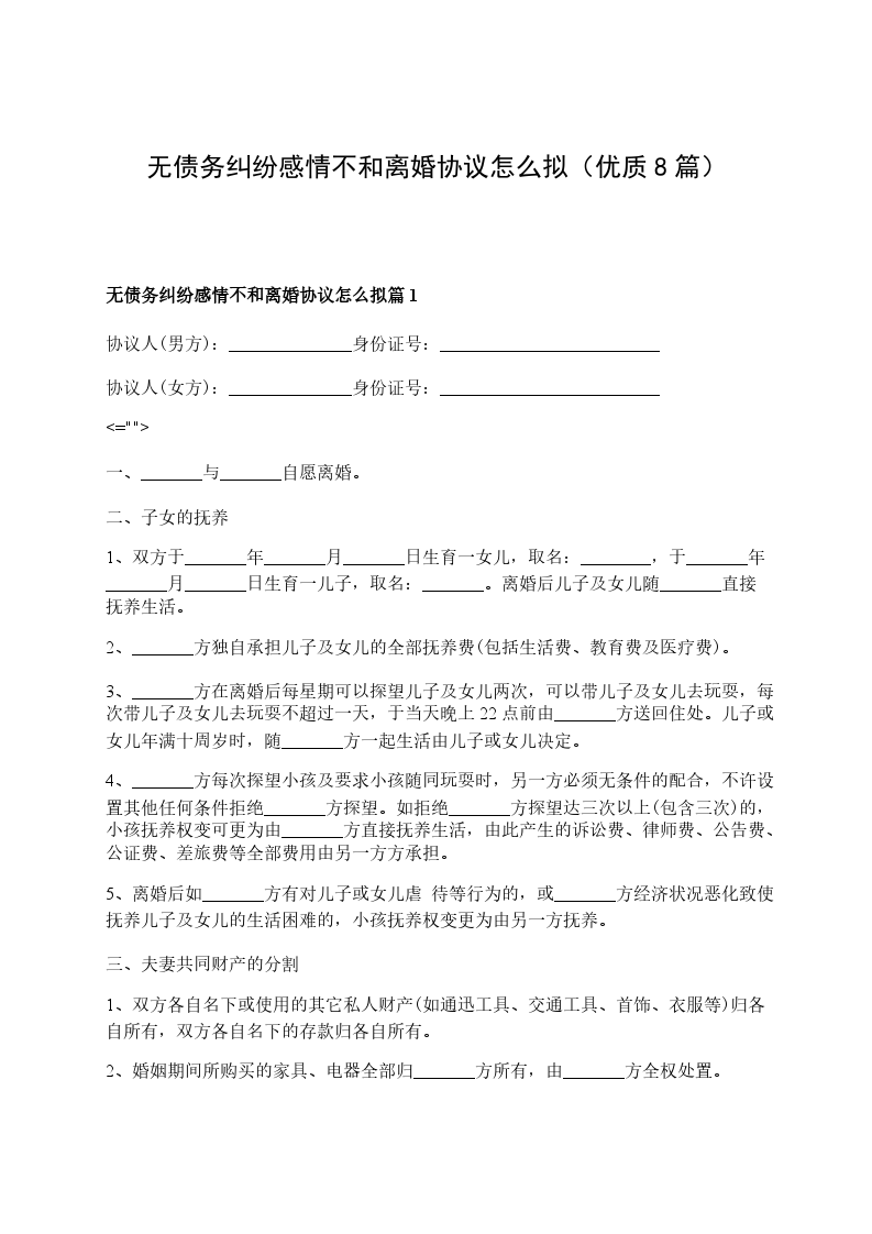 男方与女方于______年____月相识,并于______年____月____日在_________民政局登记结婚,婚后于______年____月____日生育儿子/女儿,名_________。因____________________________致使夫妻双方感情破裂,且已无任何和好可能,现经双方自愿协商达成一致意见,订立离婚协议如下: