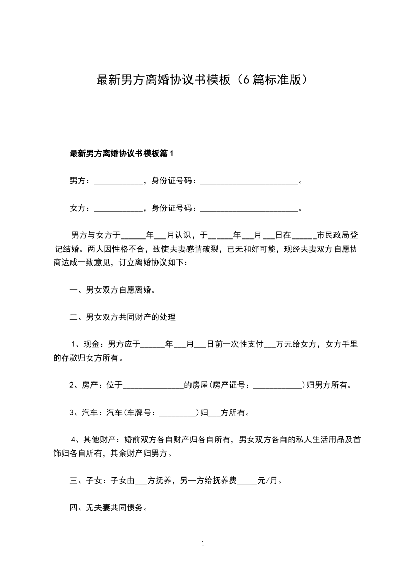 关于男方离婚协议模板篇1