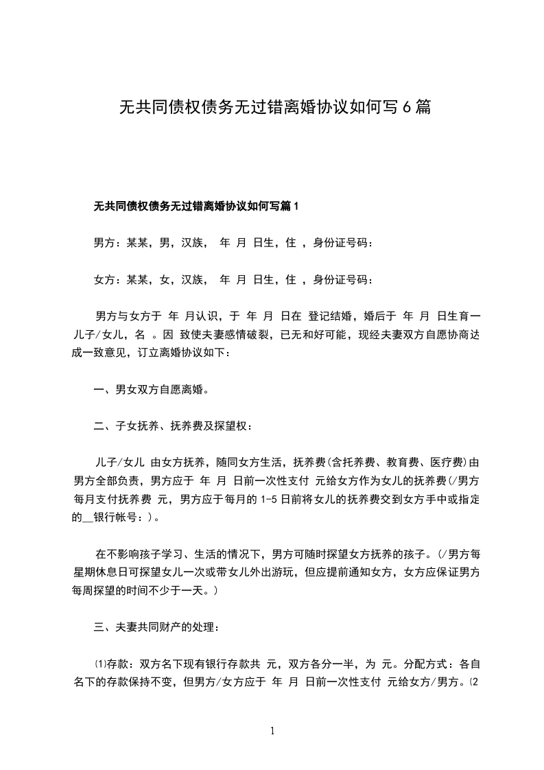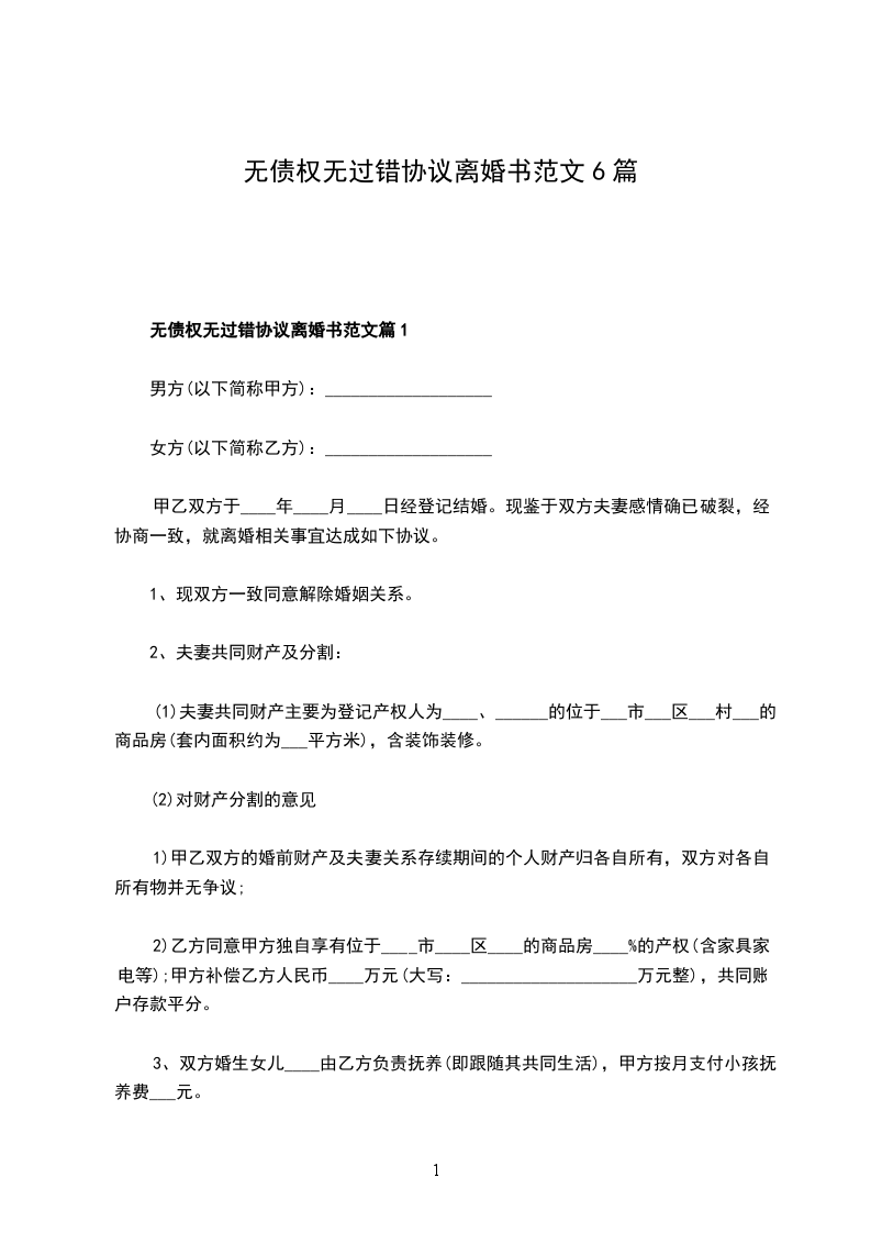 无债权无过错协议离婚书范文篇2