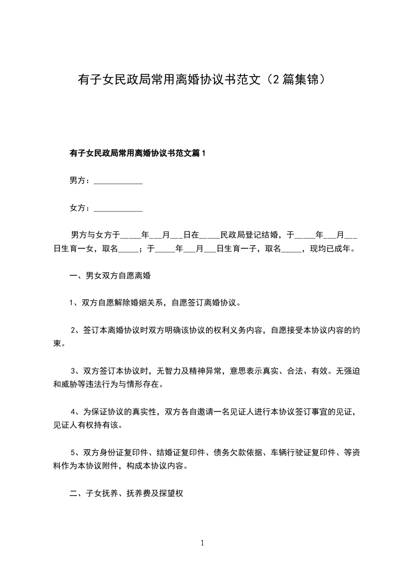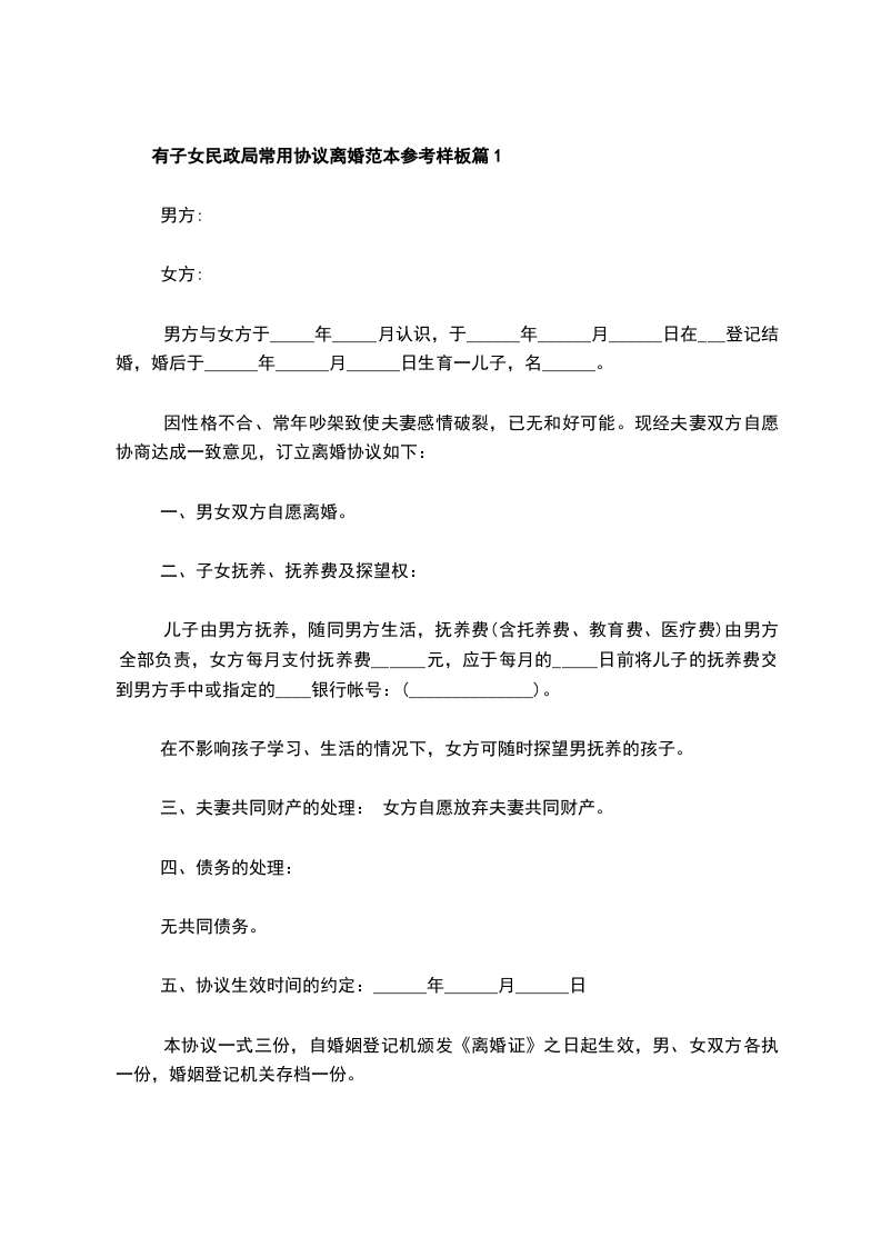 男女双方于____年__月__日在__________婚姻登记部门办理结婚登记手续,结婚证号码__________,婚后于____年__月__日生育一个儿子(女儿),名______。因双方性格不合无法共同生活,夫妻感情已经完全破裂,没有和好可能,经双方就自愿离婚事宜达成一致意见,订立离婚协议如下: