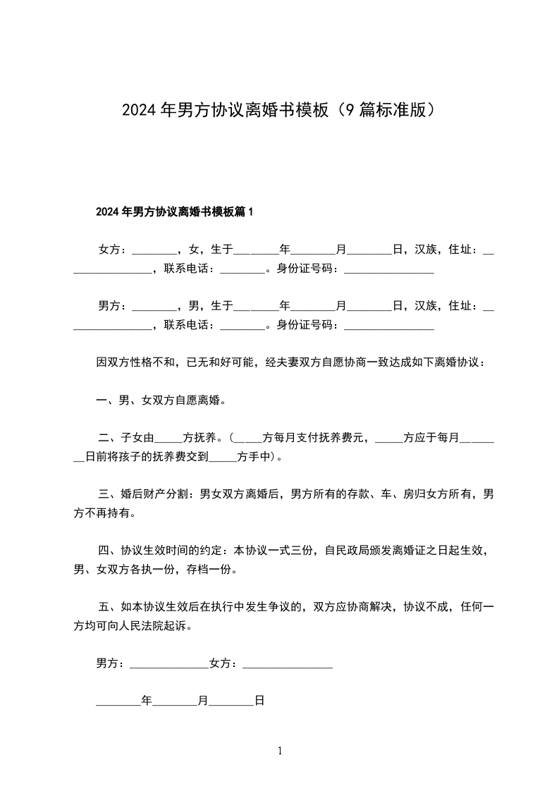 2024年男方协议离婚书模板篇9