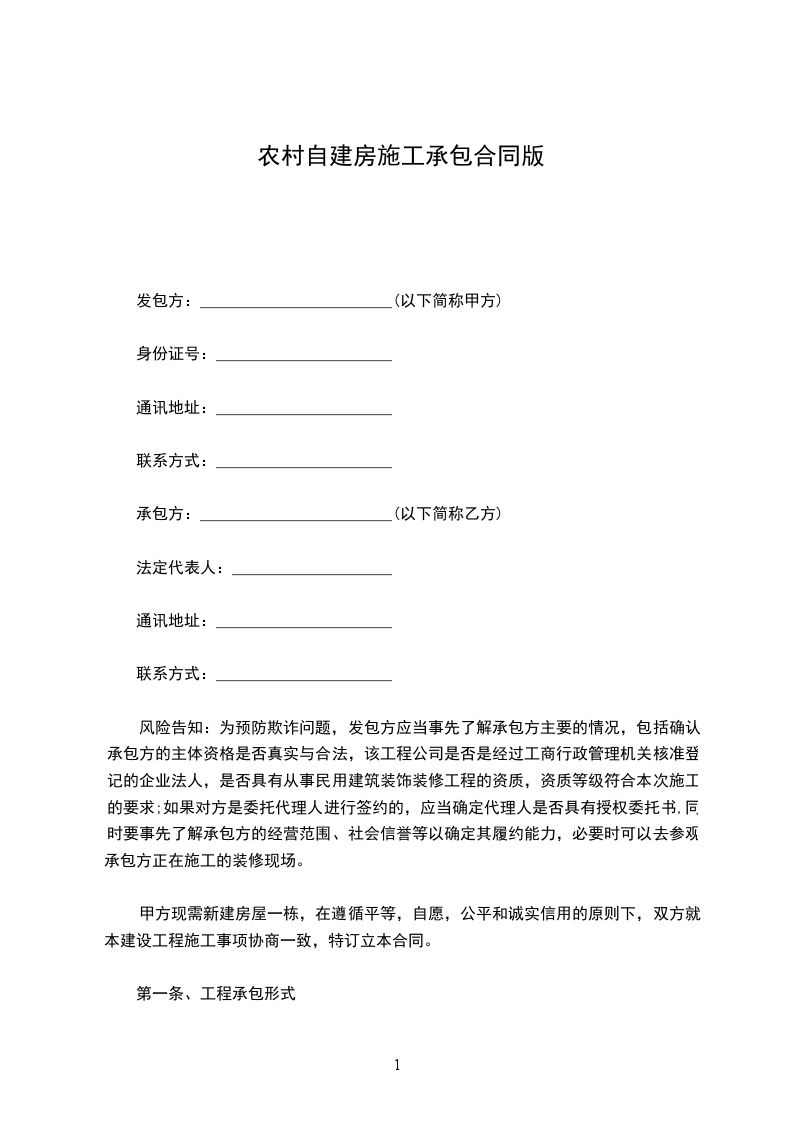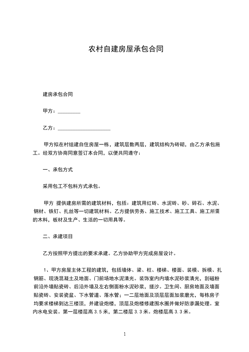 甲方拟在村组建自住房屋一栋,建筑层数两层,建筑结构为砖砌,由乙方承包施工。经双方协商同意签订本合同,以便共同遵守: