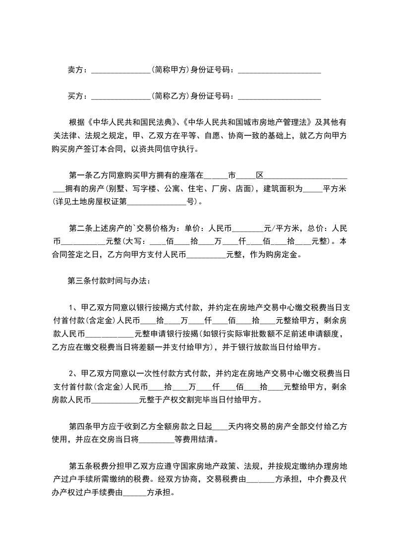 第二条上述房产的`交易价格为:单价:人民币________元/平方米,总价:人民币___________元整(大写:____佰____拾____万____仟____佰____拾____元整)。本合同签定之日,乙方向甲方支付人民币__________元整,作为购房定金。