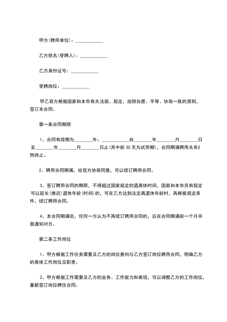 1、合同有效期为________年:____________自________年________月________日至________年________月________日止(其中前30天为试用期),合同期满聘用关系自然终止。