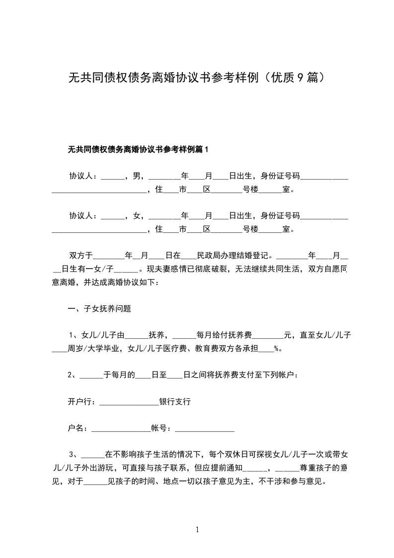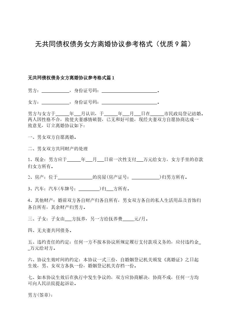 无共同的债务女方协议离婚书参考样例篇9