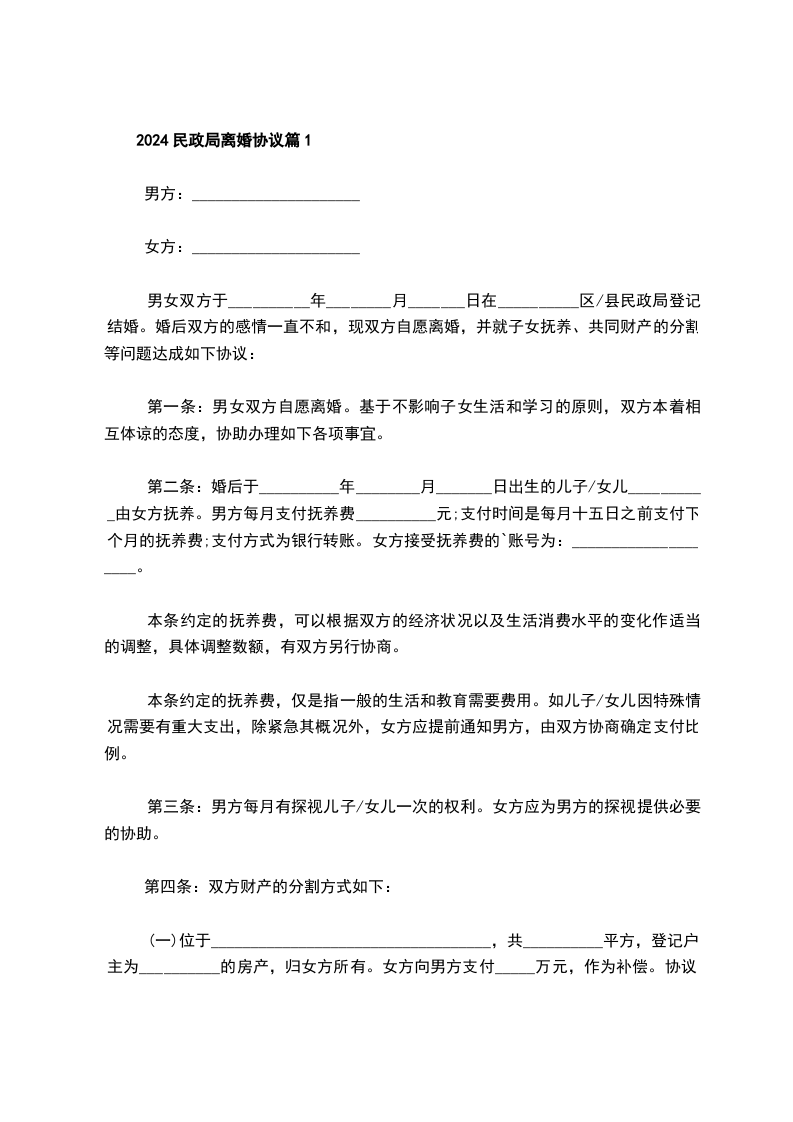 2024民政局协议离婚书参考格式篇4