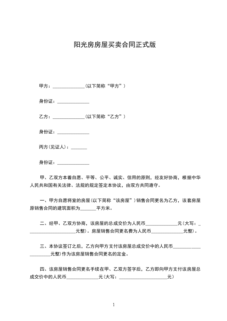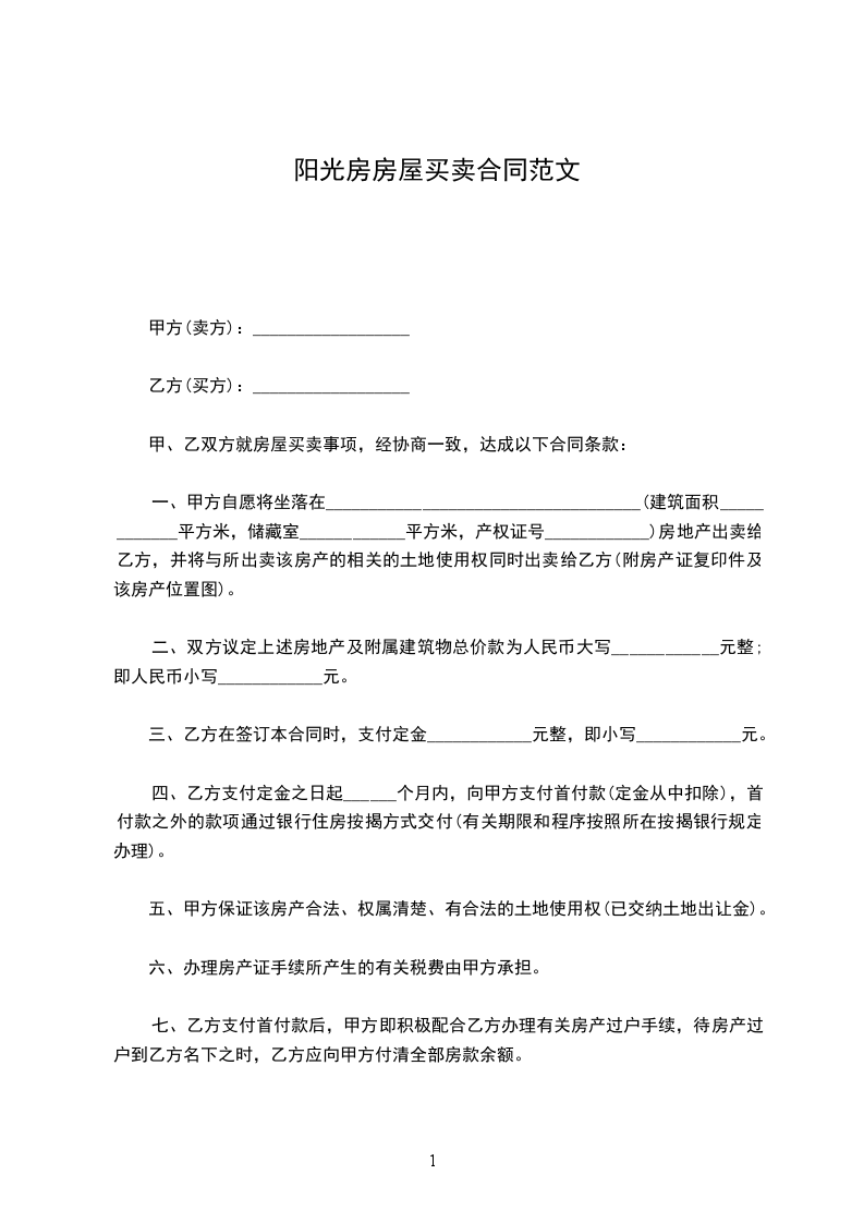 阳光房房屋买卖合同正式版