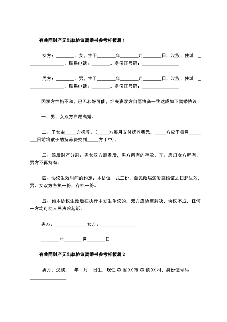 八、本协议一式三份,男、女双方各执一份,婚姻登记机关存档一份,自婚姻登记机颁发《离婚证》之日起生效。九、如本协议生效后在执行中发生争议的,双方应协商解决,协商不成,任何一方均可向相关人民法院起诉。