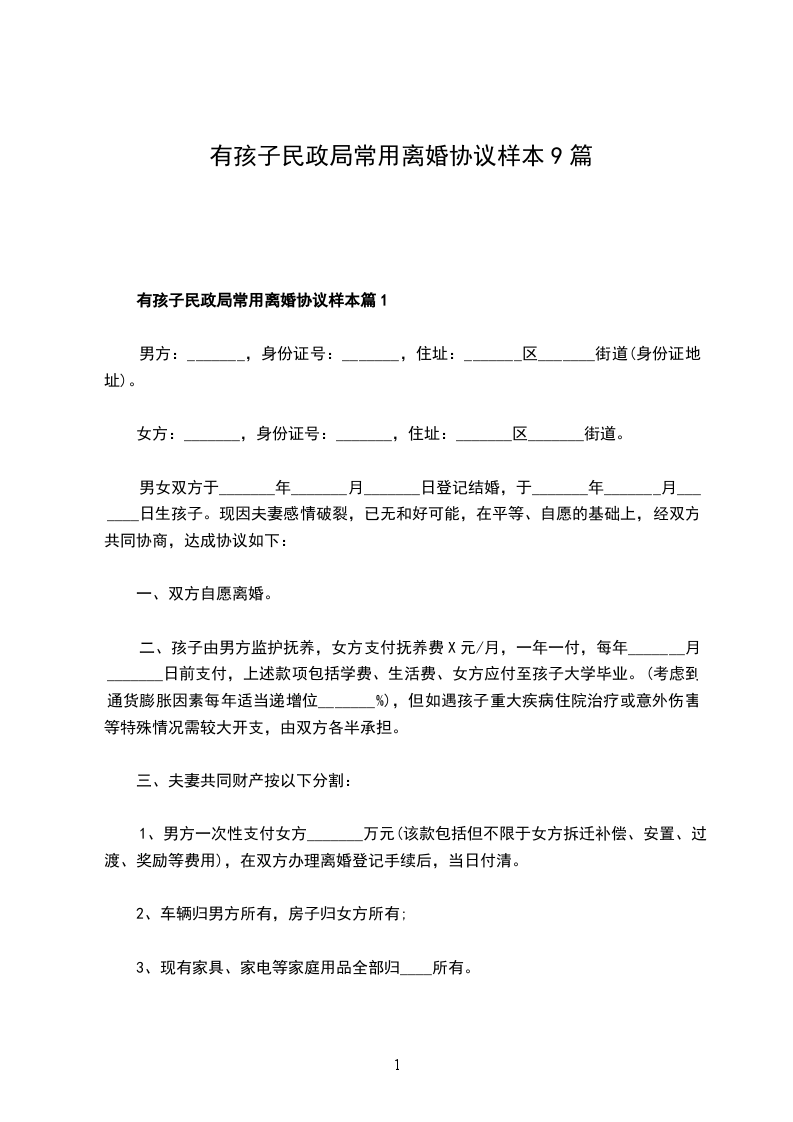协议人双方于_______年_______月_______日登记结婚,_______年_______月_______日生育一子,取名_______。现协议双方夫妻感情确已完全破裂,经双方协商一致,自愿离婚、财产分割及子女抚养事宜达成如下协议: