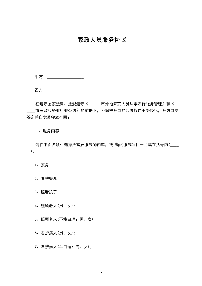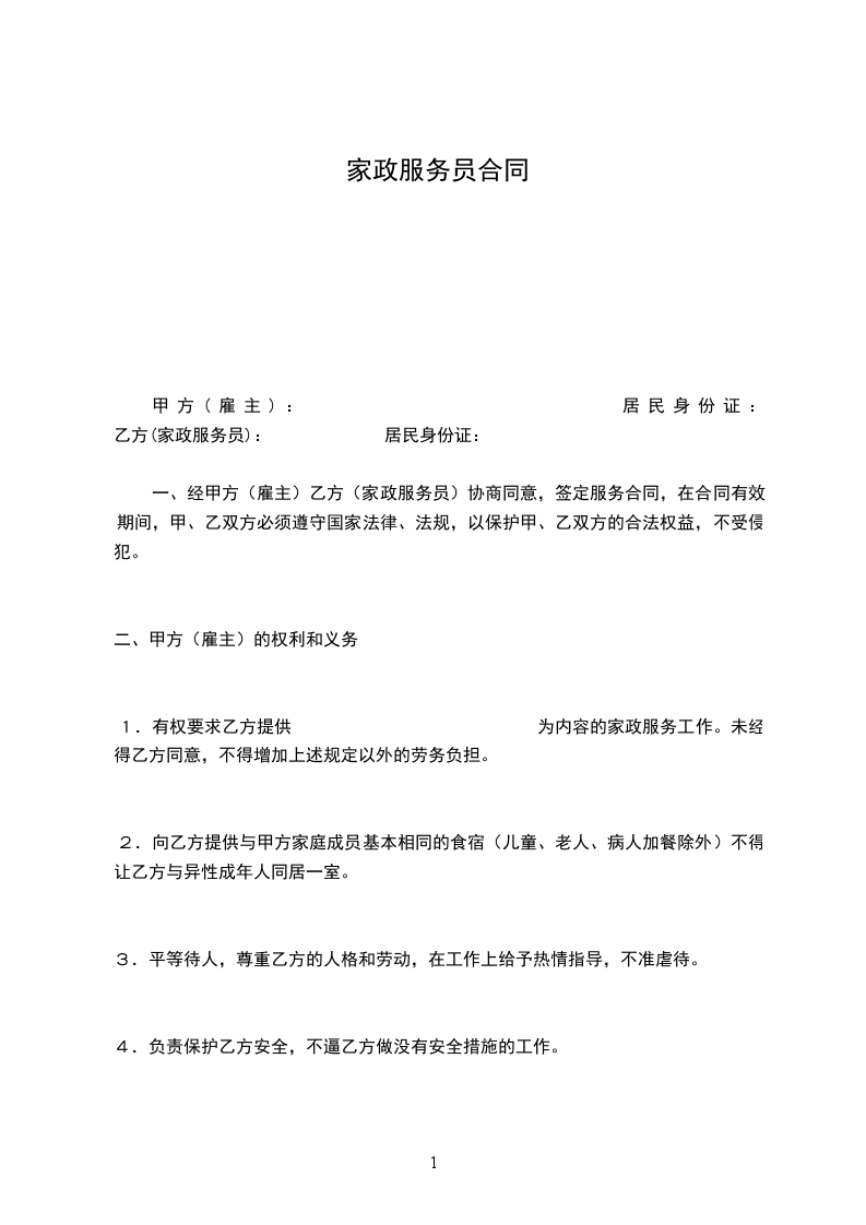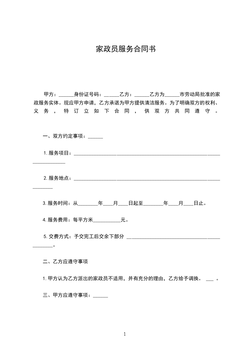 一、经甲方(雇主)乙方(家政服务员)协商同意,签定服务合同,在合同有效期间,甲、乙双方必须遵守国家法律、法规,以保护甲、乙双方的合法权益,不受侵犯。