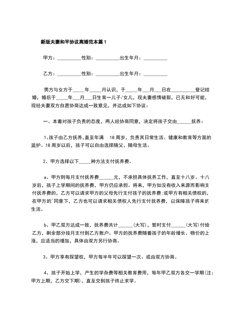 新版夫妻和平协议离婚范本篇1