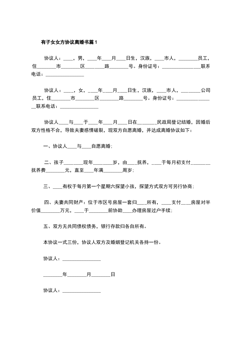 五、本协议一式三份,男女双方各持一份,存婚姻登记档案一份。