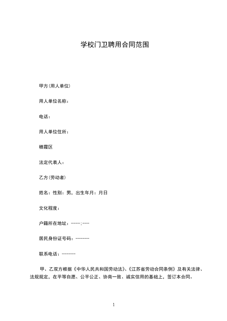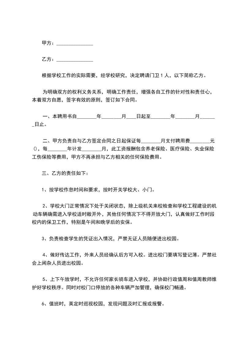 根据学校工作的实际需要,经学校研究,决定聘请门卫1人,以下简称乙方。