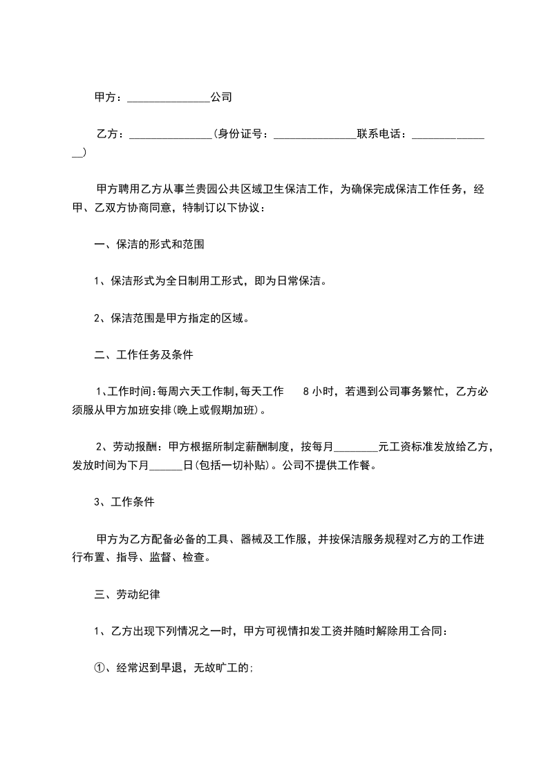 甲方聘用乙方从事兰贵园公共区域卫生保洁工作,为确保完成保洁工作任务,经甲、乙双方协商同意,特制订以下协议: