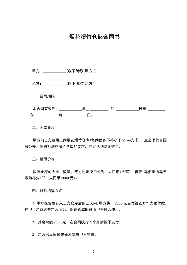 甲方向乙方租用二间烟花爆竹仓库(每间面积不得小于25平方米),且必须符合国家公安、消防对烟花爆竹仓库的要求,并能达到防潮效果。