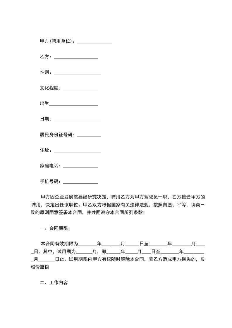 甲方因企业发展需要经研究决定,聘用乙方为甲方驾驶员一职,乙方接受甲方的聘用,决定出任该职位。甲乙双方根据国家有关法律法规,按照自愿、平等,协商一致的原则同意签署本合同,并共同遵守本合同所列条款:
