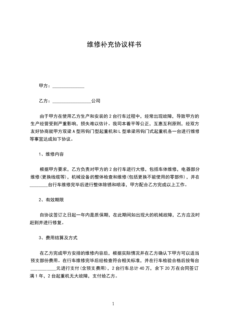 在乙方完成甲方安排的维修内容后,根据实际情况并在乙方确认下甲方可以适当预支部份费用。在行车维修完毕后经检查符合相关标准,并在行车检验合格后按每台___________元进行支付(含预支费用),2台行车总计40万,余下20万在合同签订满1年,2台起重机无大故障,支付给乙方。