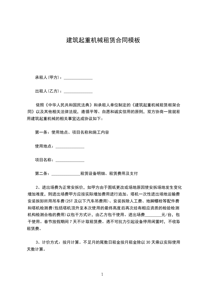 依照《中华人民共和国民法典》和承租人单位制定的《建筑起重机械租赁框架合同》以及其他相关法律法规,遵循平等、自愿和诚实信用的原则,双方协商一致就租用建筑起重机械的相关事宜达成协议如下: