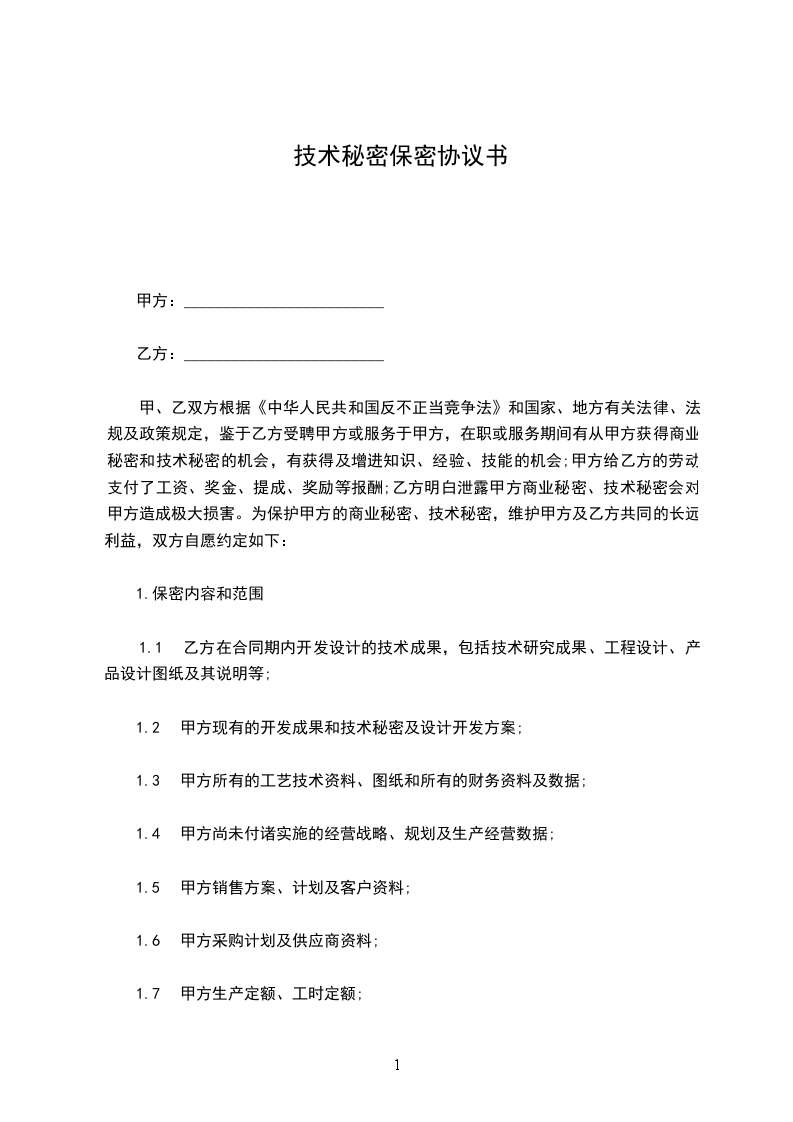 甲、乙双方根据《中华人民共和国反不正当竞争法》、《中华人民共和国专利法》和国家、地方有关法律、法规及政策规定,鉴 乙方为甲方加工具有国家专利权的产品的生产用模具和备件,有获得本产品技术秘密的机会,甲方给乙方的加工支付报酬;乙方明白泄露甲方商业秘密、技术秘密会对甲方造成极大损害。为保护甲方的商业秘密、技术秘密,维护甲方及乙方共同的长远合作利益,双方自愿约定如下: