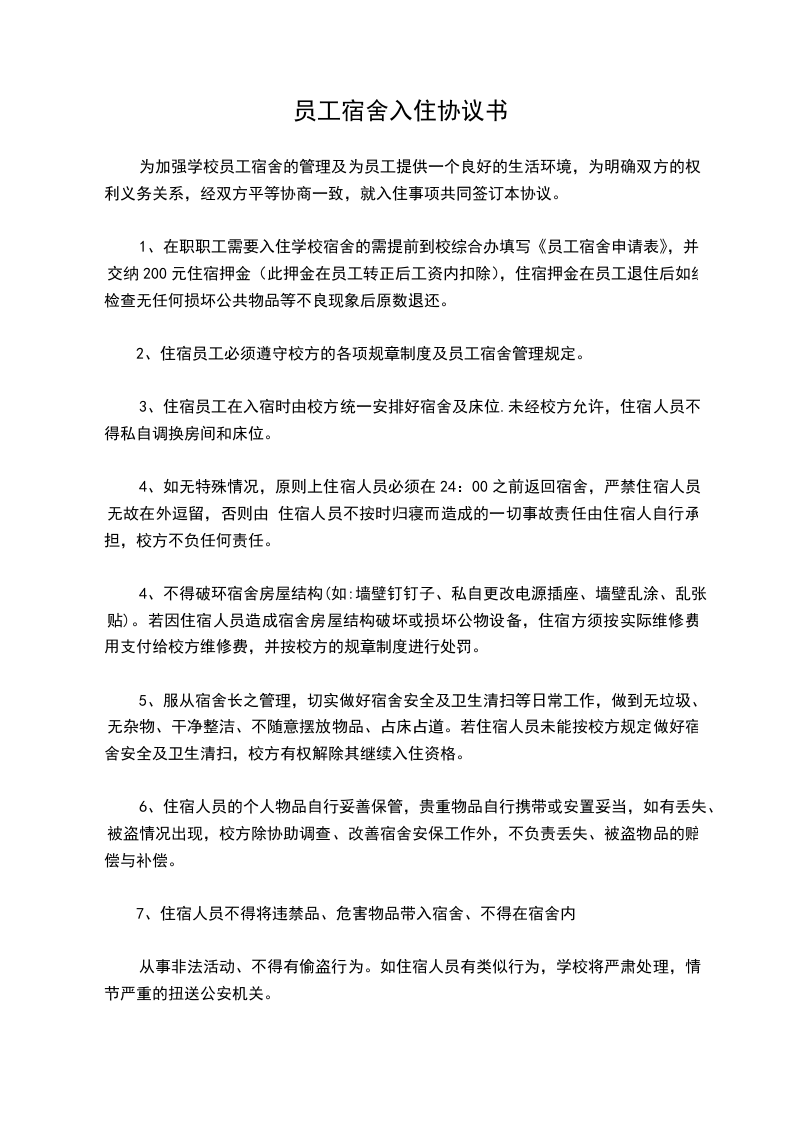 为加强学校员工宿舍的管理及为员工提供一个良好的生活环境,为明确双方的权利义务关系,经双方平等协商一致,就入住事项共同签订本协议。