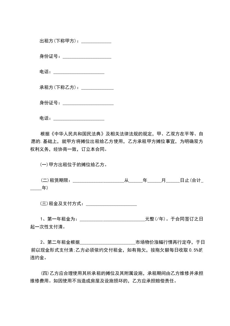 根据《中华人民共和国民法典》及相关法律法规的规定,甲、乙双方在平等、自愿的.基础上,就甲方将摊位出租给乙方使用,乙方承租甲方摊位事宜,为明确双方权利义务,经协商一致,订立本合同。