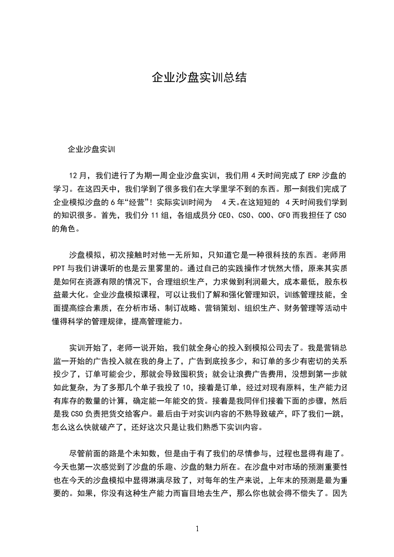12月,我们进行了为期一周企业沙盘实训,我们用4天时间完成了ERP沙盘的学习。在这四天中,我们学到了很多我们在大学里学不到的东西。那一刻我们完成了企业模拟沙盘的6年“经营”!实际实训时间为4天。在这短短的4天时间我们学到的知识很多。首先,我们分11组,各组成员分CEO、CSO、COO、CFO而我担任了CSO的角色。