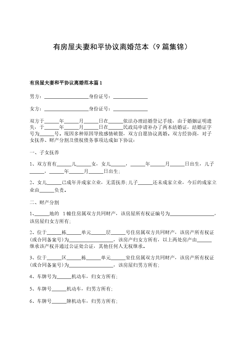 (1)夫妻购有坐落在________市_____________路____________________住房一套,合同价人民币________万元(大写:___________________________),现值人民币________万元(大写:__________________________)。购房时以____方主贷人贷款________万元(大写:________________________),现剩余贷款本金________万元(大写:______________________)。该房购买时首付________万元(大写:______________________)。现协商该套房产归____方所有,由____方一次性给付____方现金________万元(大写:______________________),此款在本协议签订后日付清。