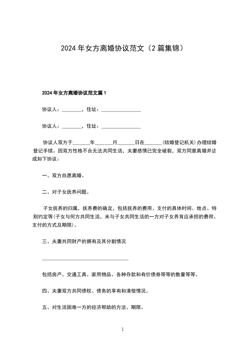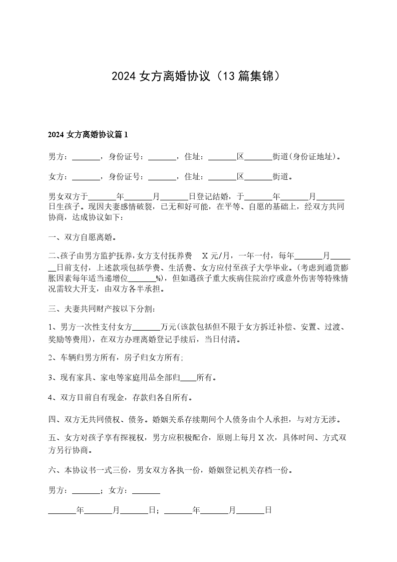 三、双方有夫妻共同财产座落在______路______小区______室商品房一套,价值人民币______万元,现协商归女方乙方所有,由女方一次性给付男方甲方现金______万元,此款在本协议签订后的第二天付清;此房内的家用电器及家俱归女方所有,存款归女方所有。