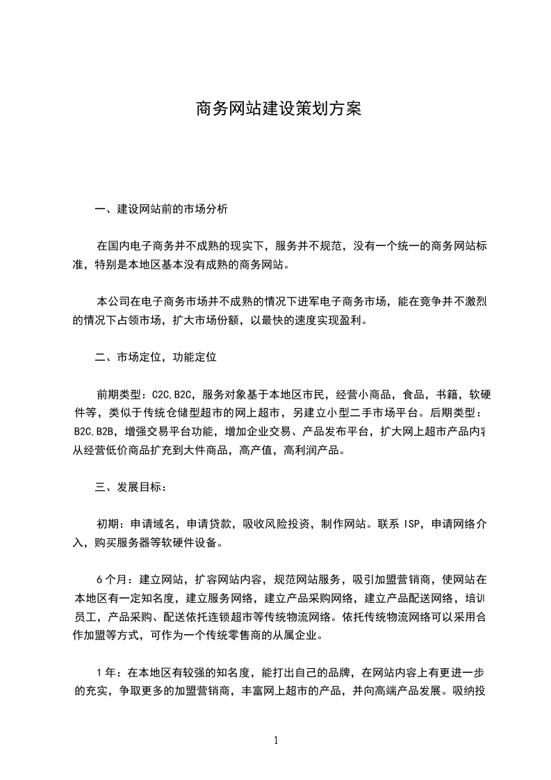 1年:在本地区有较强的知名度,能打出自己的品牌,在网站内容上有更进一步的充实,争取更多的加盟营销商,丰富网上超市的产品,并向高端产品发展。吸纳投资,扩大经营范围,着手建立B2B商业交易平台。实现网站盈利。2年:达到本地区最大的几个电子商务网站之一,巩固市场份额,网站集成,B2B,B2C,C2C三种经营方式为一体,建设独立的物流体系,降低经营成本。在巩固低端产品市场的同时,重心向高端产品发展,建立以高利润,高附加值产品为主的经营体系。