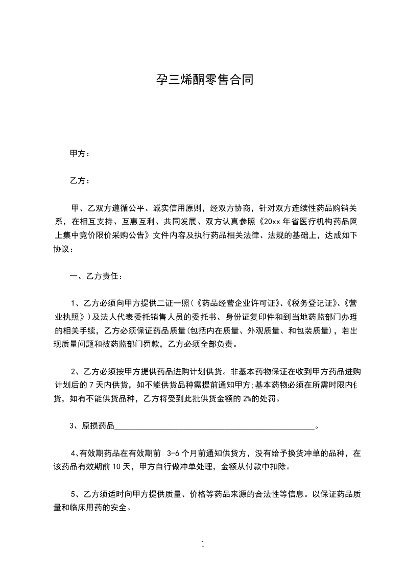 根据《中华人民共和国民法典》,甲、乙双方经协商确定,甲方向乙方购买药品。为明确双方责任和权利,特签订本合同,共同遵守。具体条款如下: