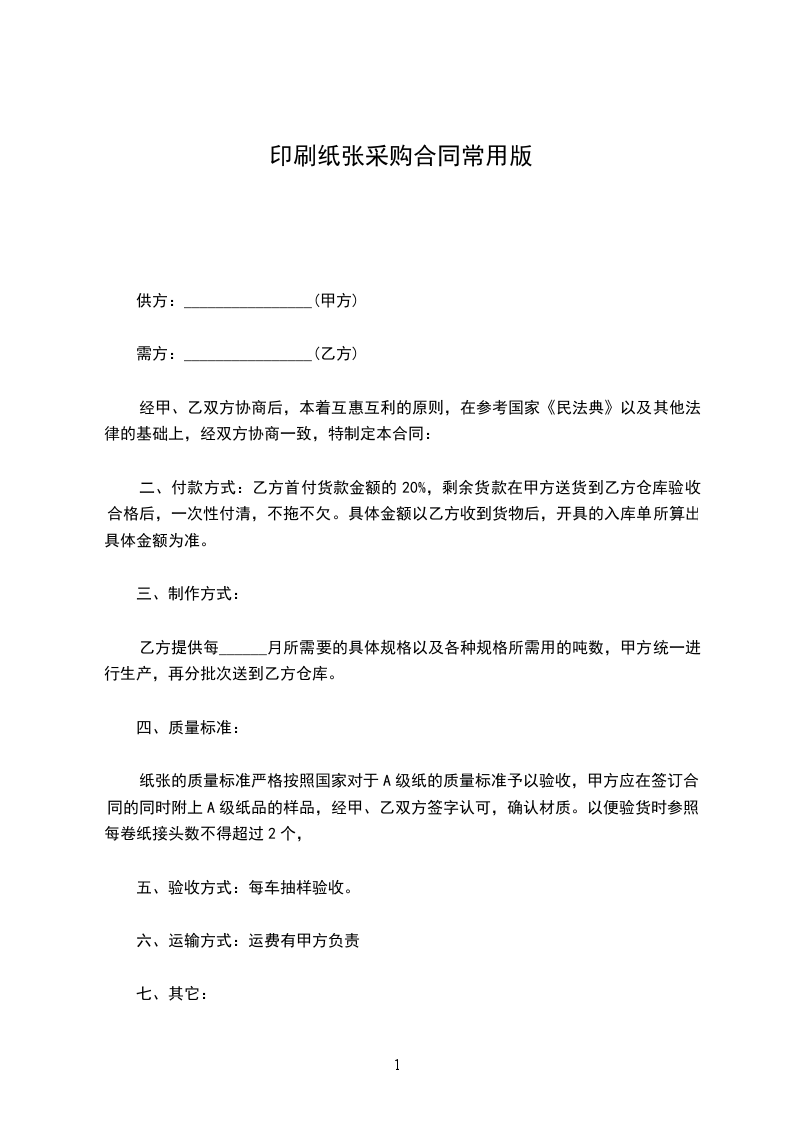 纸张的质量标准严格按照国家对于A级纸的质量标准予以验收,甲方应在签订合同的同时附上A级纸品的样品,经甲、乙双方签字认可,确认材质。以便验货时参照。每卷纸接头数不得超过2个,