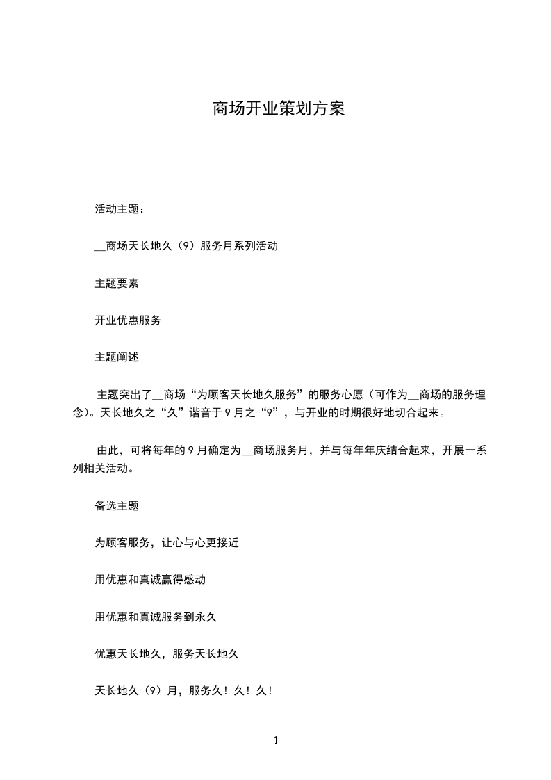 主题突出了__商场“为顾客天长地久服务”的服务心愿(可作为__商场的服务理念)。天长地久之“久”谐音于9月之“9”,与开业的时期很好地切合起来。