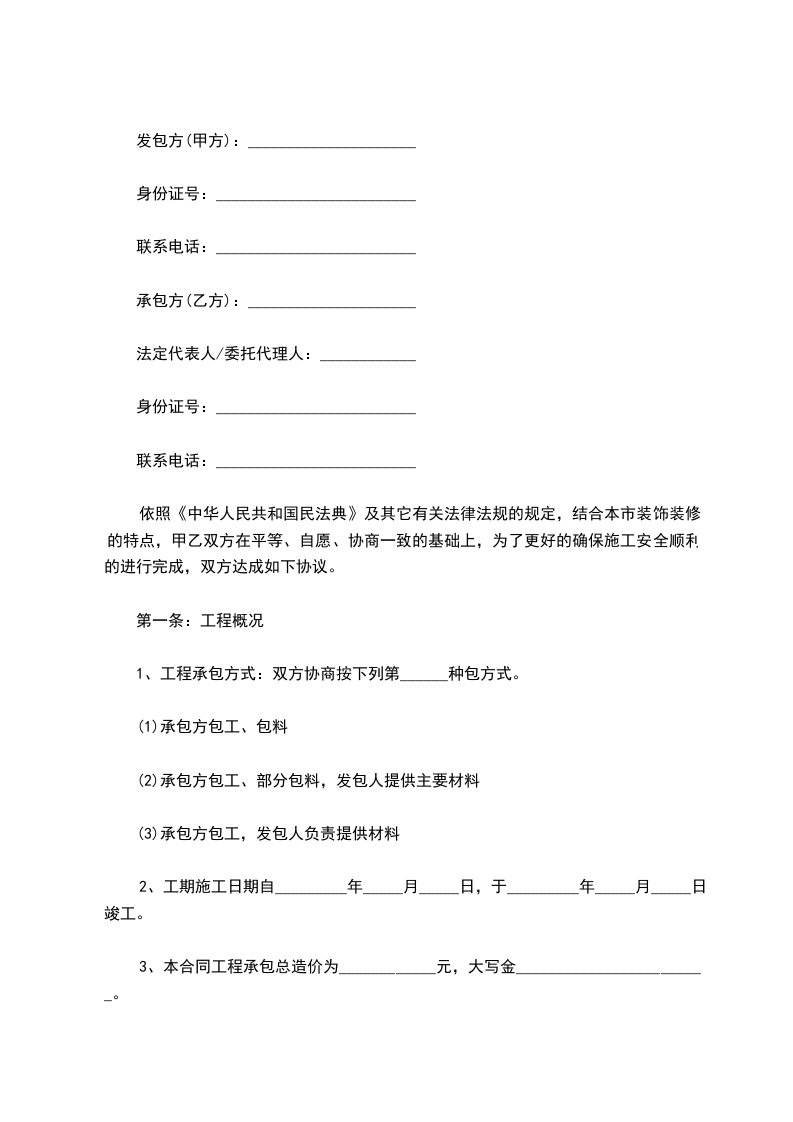 根据《中华人民共和国民法典》、《住宅室内装饰装修管理办法》(建设部第110号令)及其它有关法律、法规,结合室内装饰装修工程的特点和具体情况,双方在平等、自愿、友好协商的基础上,就甲方装饰装修工程的有关事宜,达成以下协议: