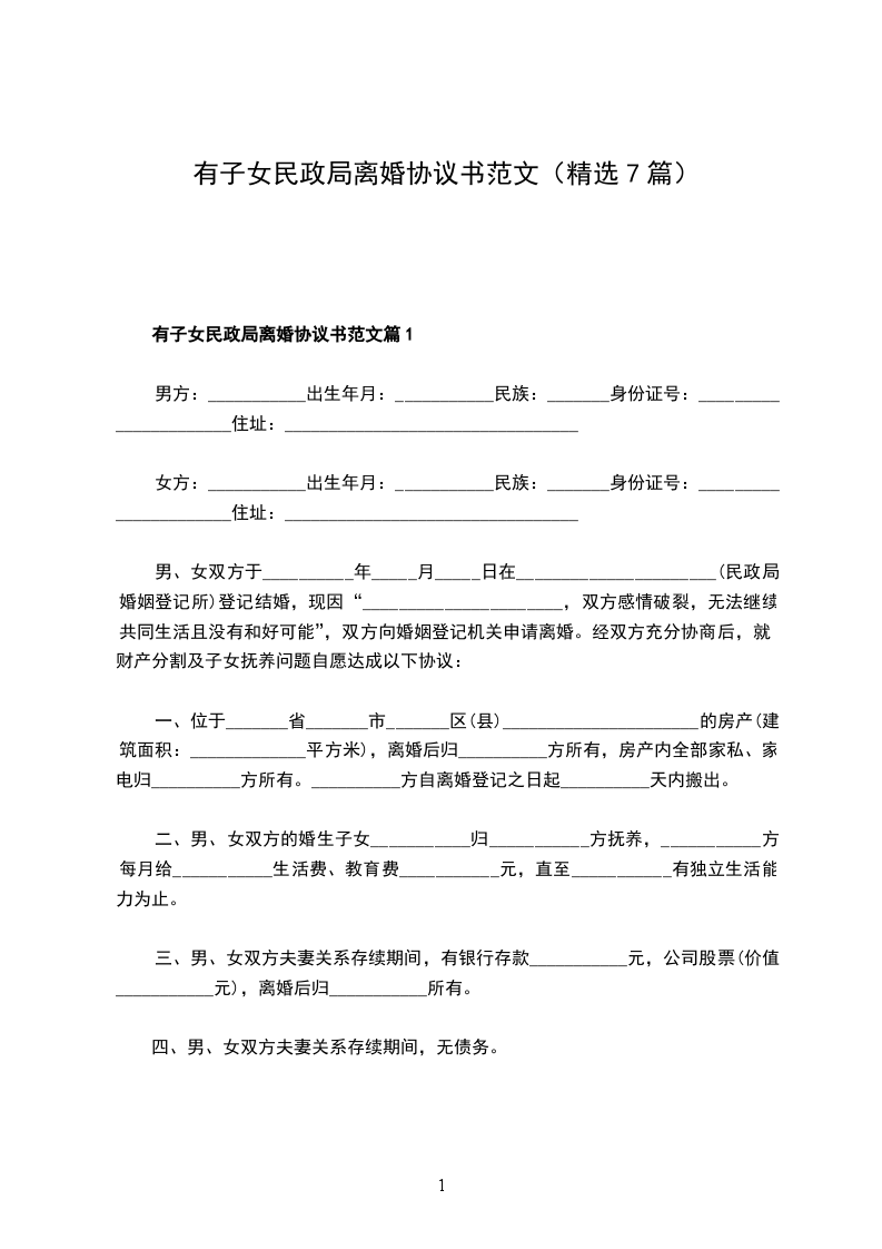 注:本协议一式______份,男女双方各______份,婚姻登记机关_____份。