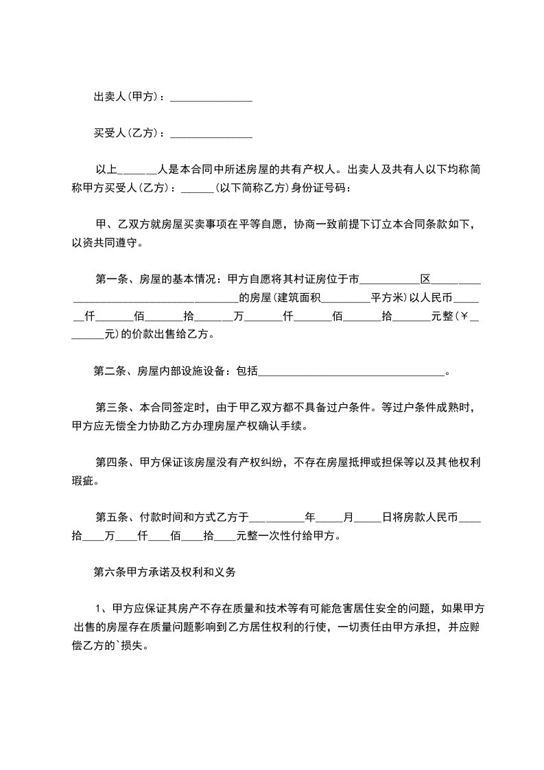 第一条、房屋的基本情况:甲方自愿将其村证房位于市___________区_______________________________________的房屋(建筑面积_________平方米)以人民币_______仟_______佰_______拾_______万_______仟_______佰_______拾_______元整(¥________元)的价款出售给乙方。